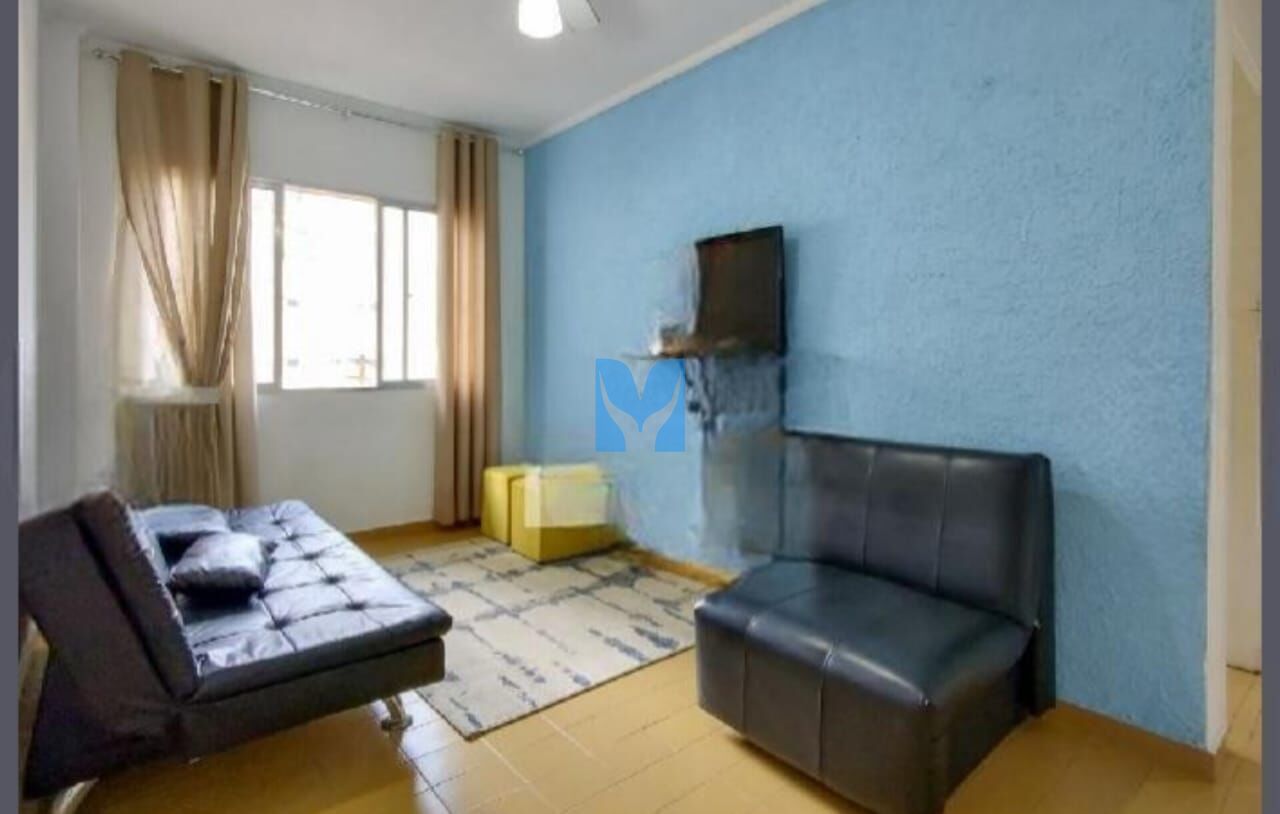 Apartamento com sacada, vista parcial do Mar, mobiliado à venda no bairro Tupi em Praia Grande, SP. 1 dormitório!