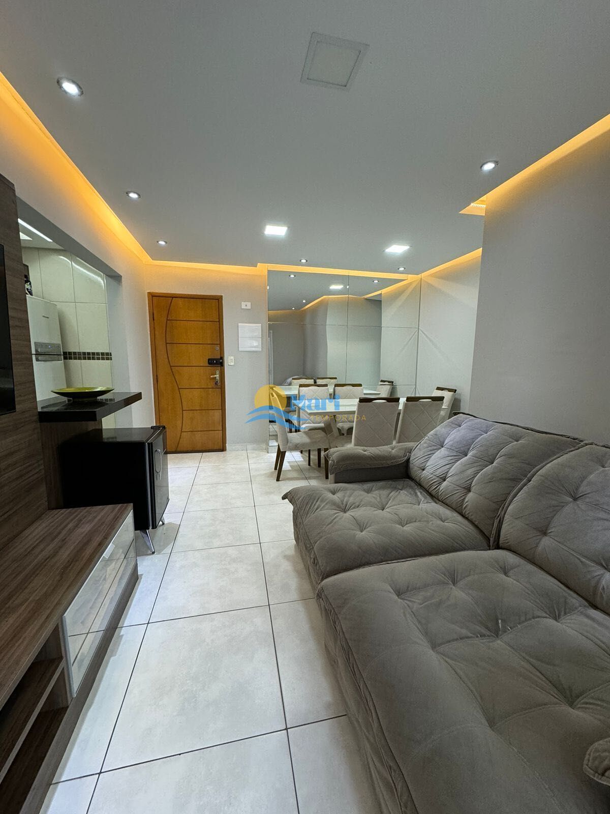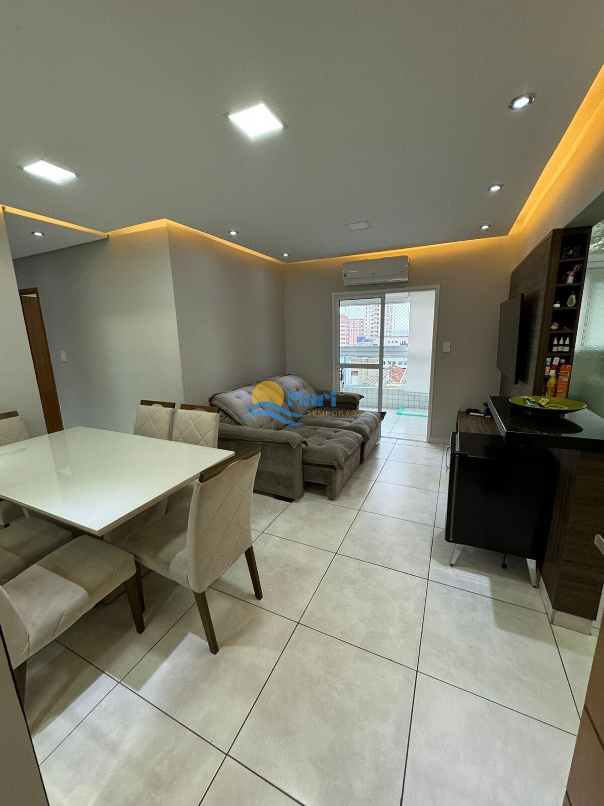 Apartamento à venda no bairro Tupi em Praia Grande, SP. 2 dormitórios (sendo 1 suíte), sala com sacada gourmet envidraçada, cozinha, área de serviço, banheiro social e uma vaga de garagem.