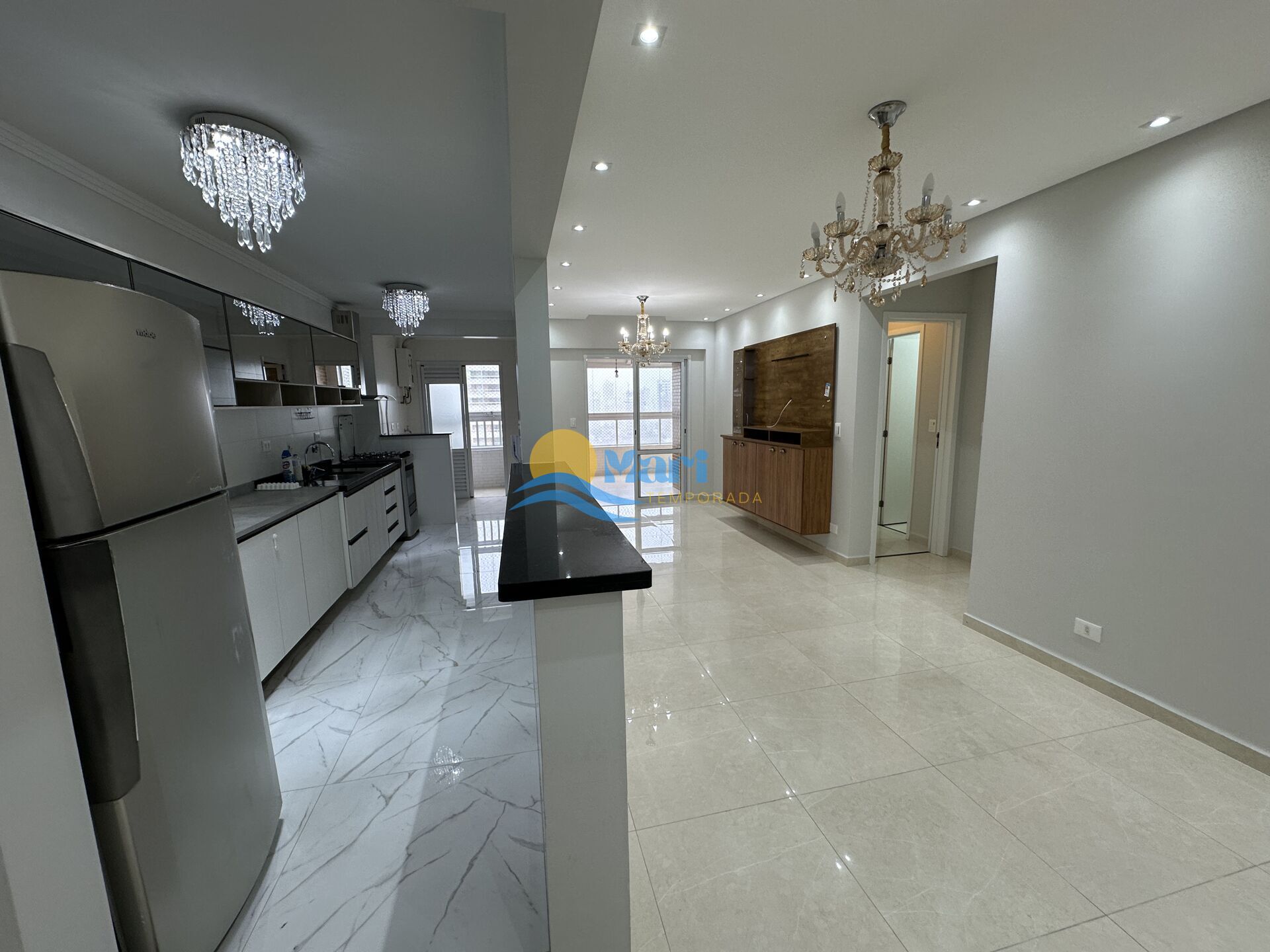 Apartamento à venda no bairro Aviação em Praia Grande, SP. 2 dormitórios, sala, cozinha, área de serviço, banheiro social e uma vaga de garagem.
