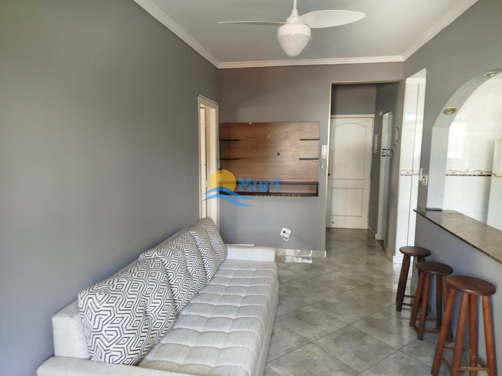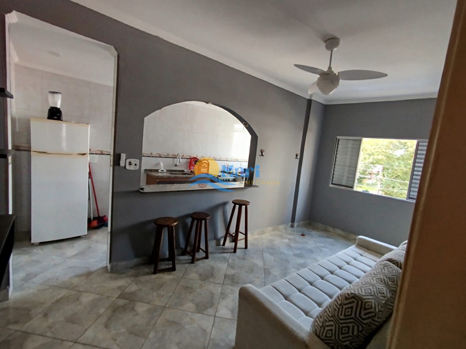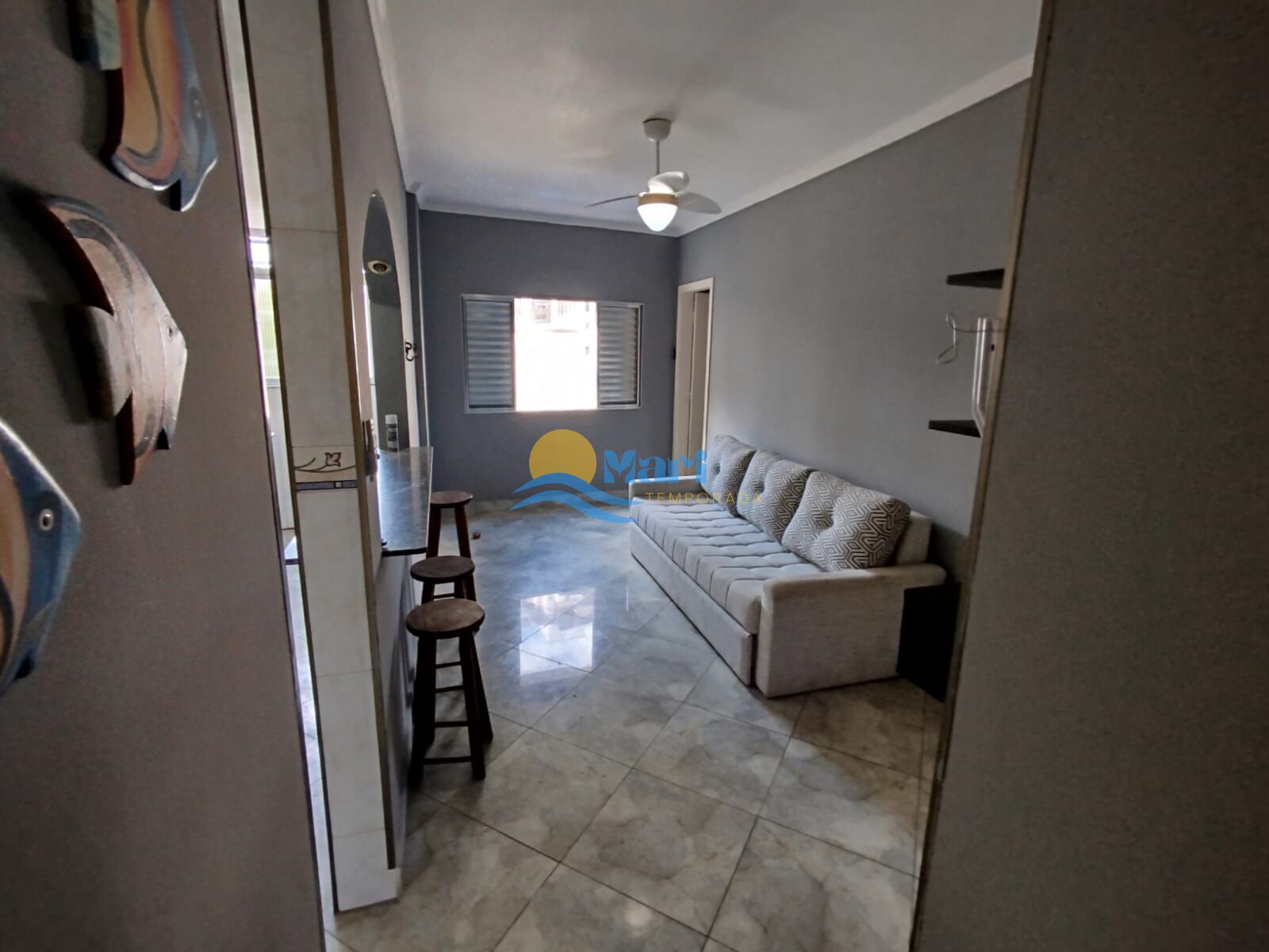 Apartamento à venda no bairro Aviação em Praia Grande, SP. 2 dormitórios, sala, cozinha, área de serviço, banheiro social e duas vagas de garagem. mobiliado