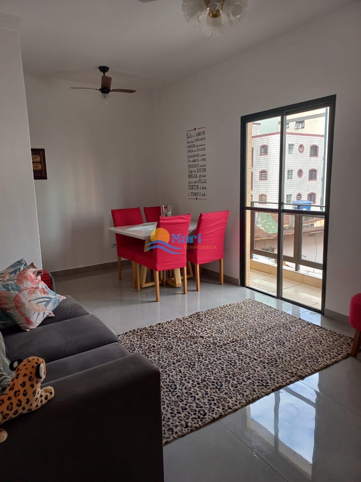1 dormitório com sacada, sala dois ambientes com sacada, cozinha bem espaçosa, área de serviço, banheiro social e uma vaga de garagem.