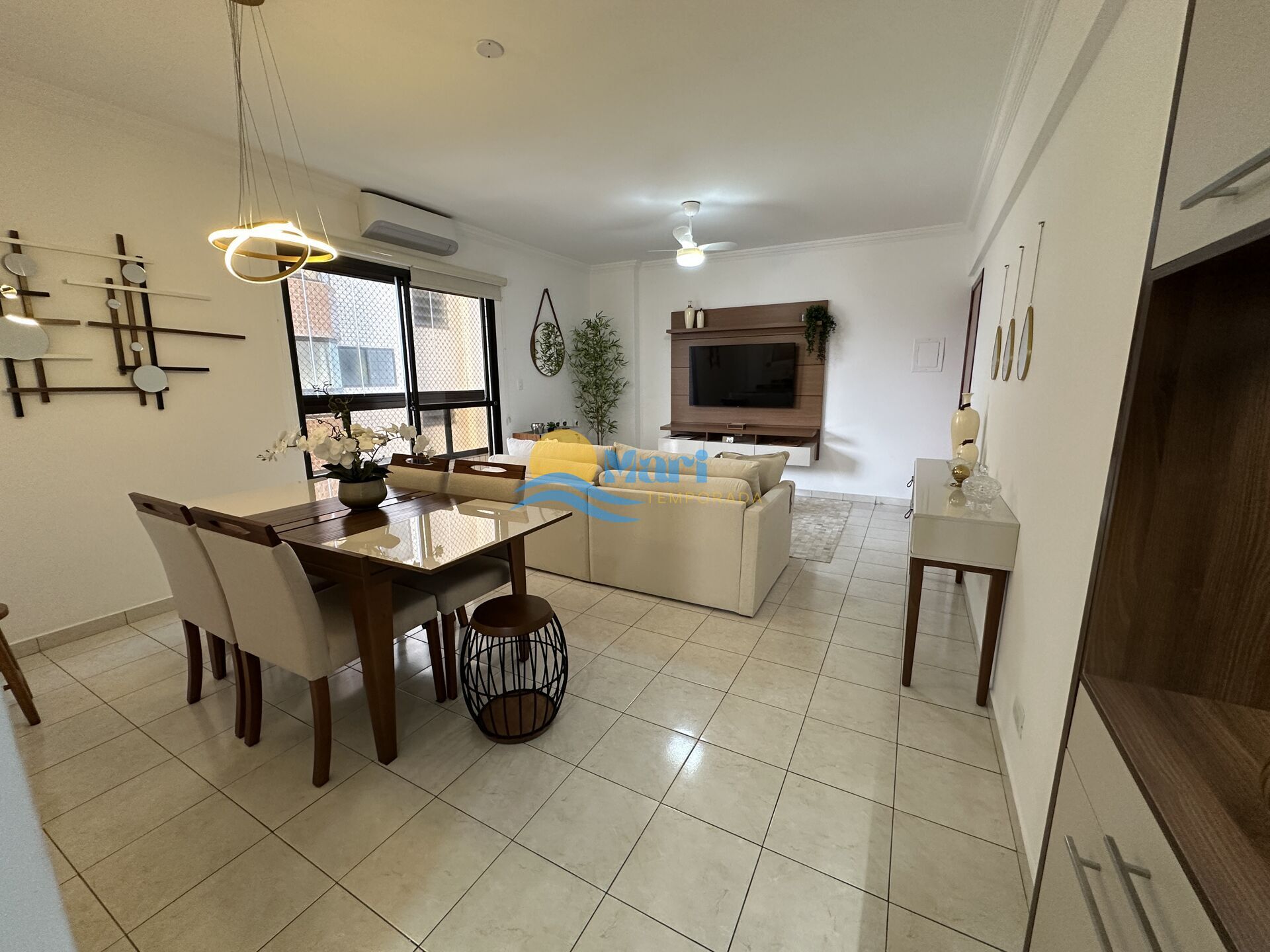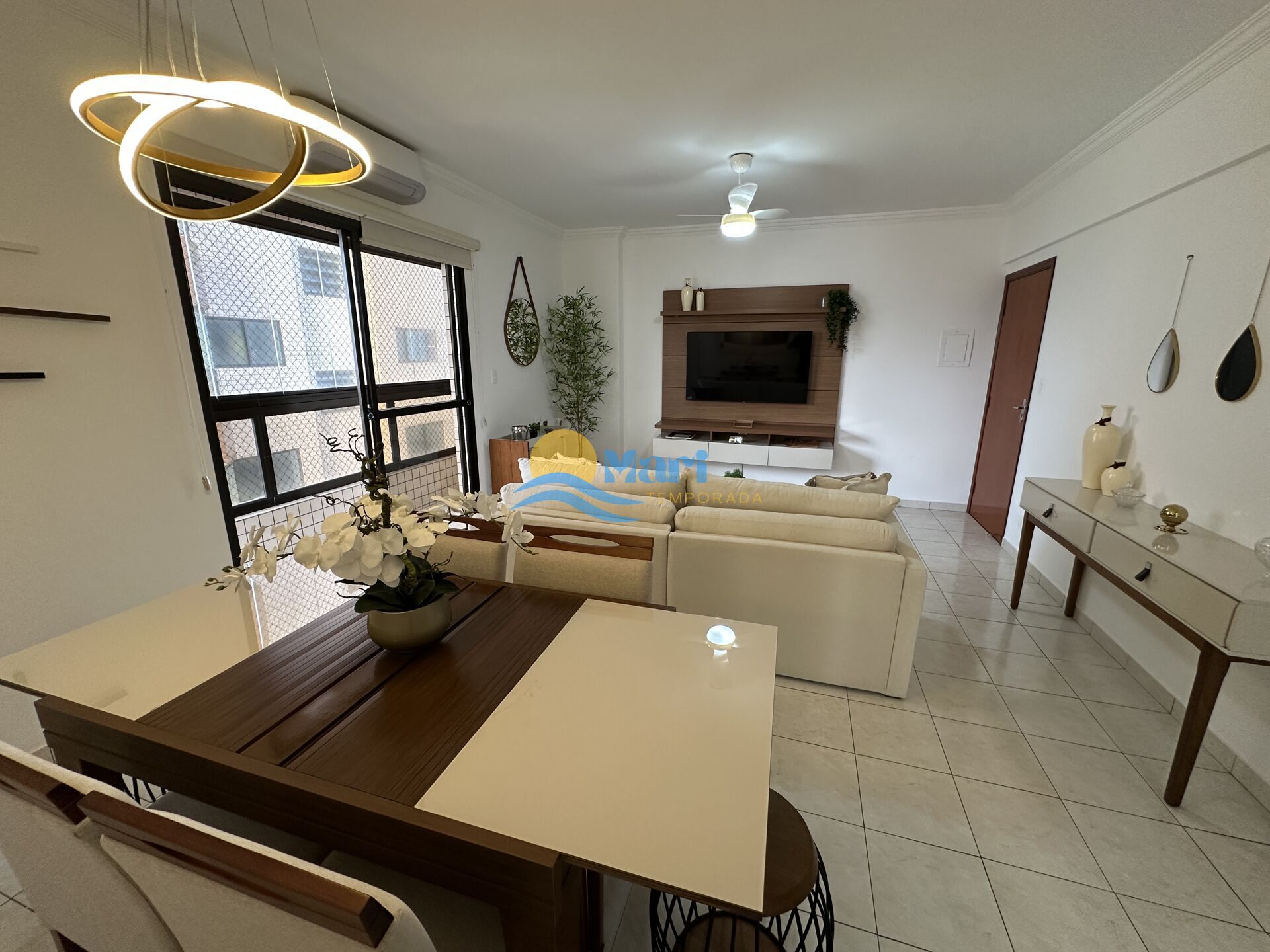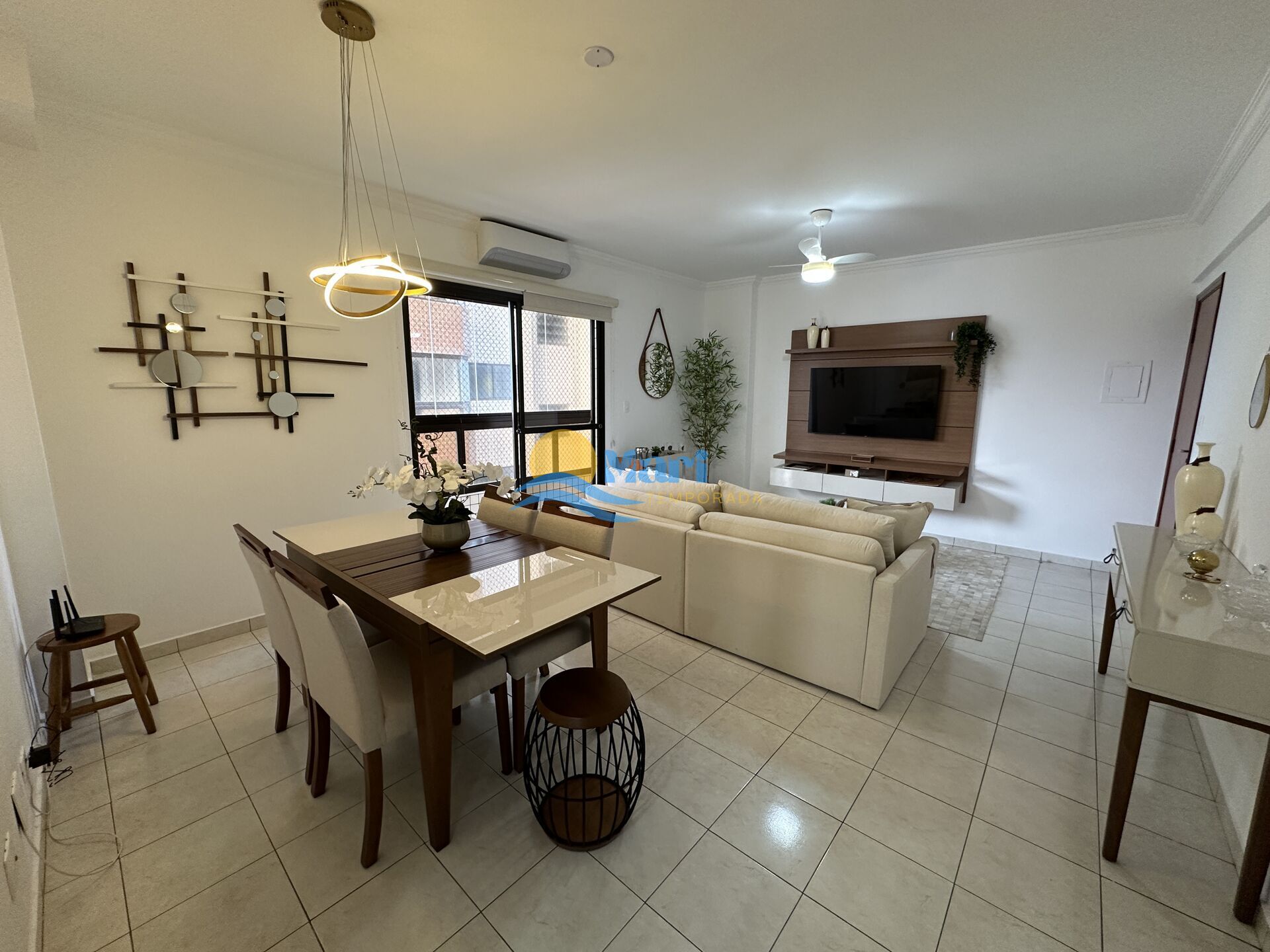 Apartamento à venda no bairro Caiçara em Praia Grande, SP. 1 suíte, sala dois ambientes com sacada envidraçada, cozinha planejada, área de serviço, banheiro social e uma vaga de garagem.