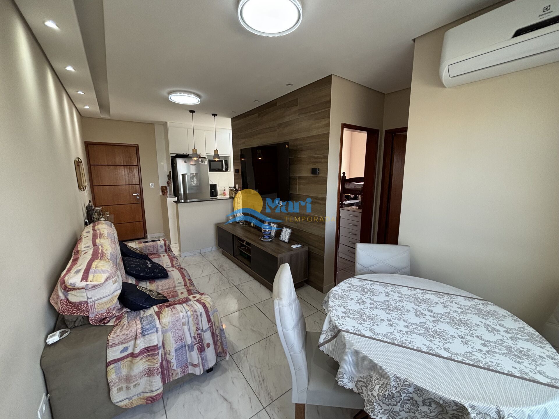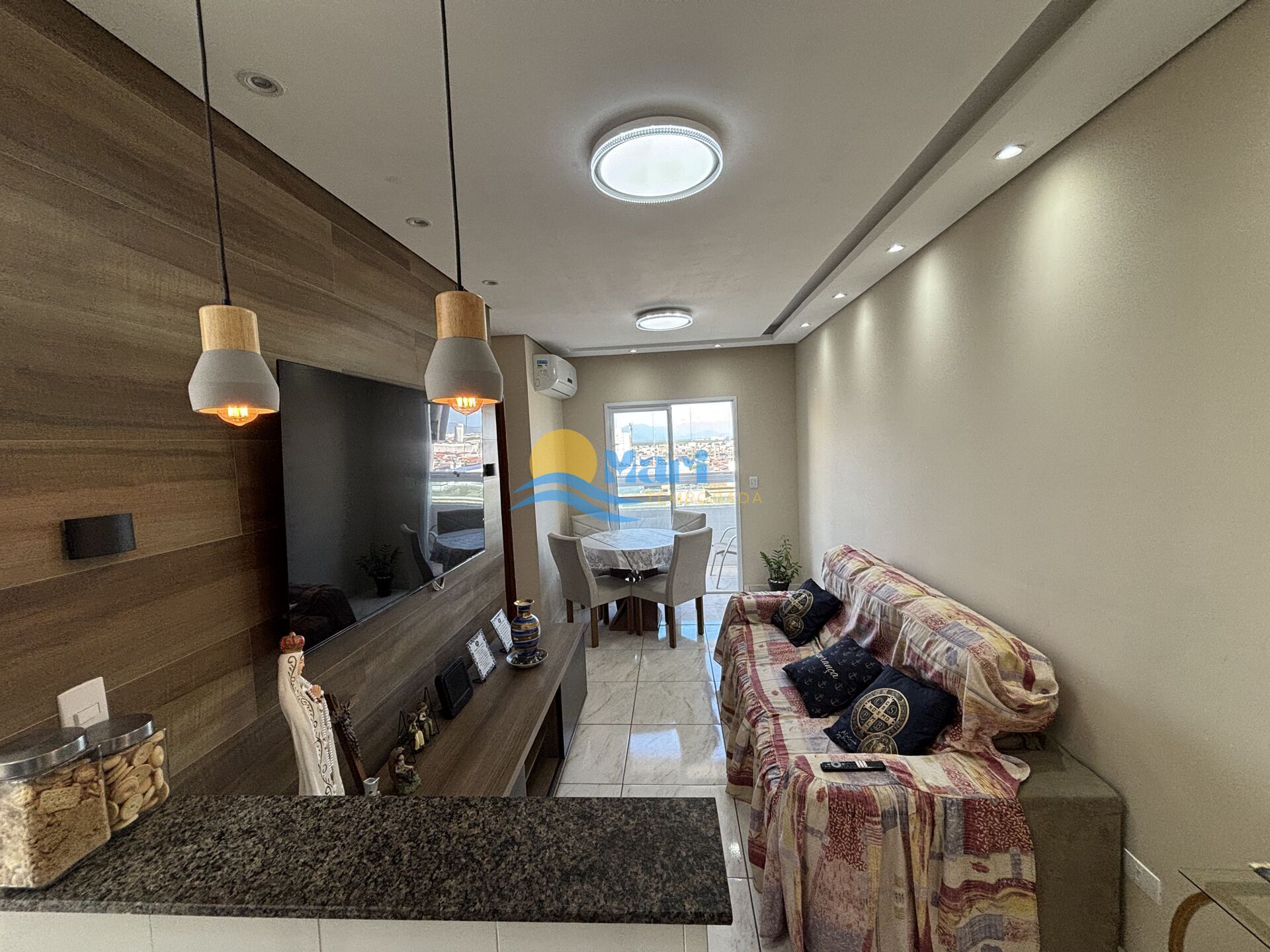 Apartamento à venda no bairro Ocian em Praia Grande, SP. 2 dormitórios, sala dois ambientes com sacada envidraçada e vista livre, cozinha planejada, área de serviço, banheiro social e uma vaga de garagem.