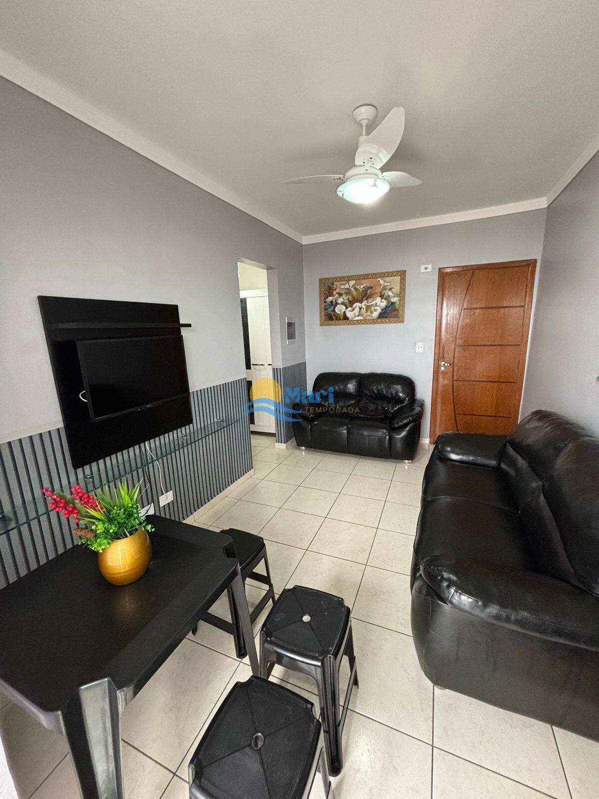Apartamento à venda no bairro Mirim em Praia Grande, SP. 1 dormitório, sala dois ambientes com varanda, cozinha, 1 banheiros, área de serviço e 1 vaga de garagem. Vista para o mar.