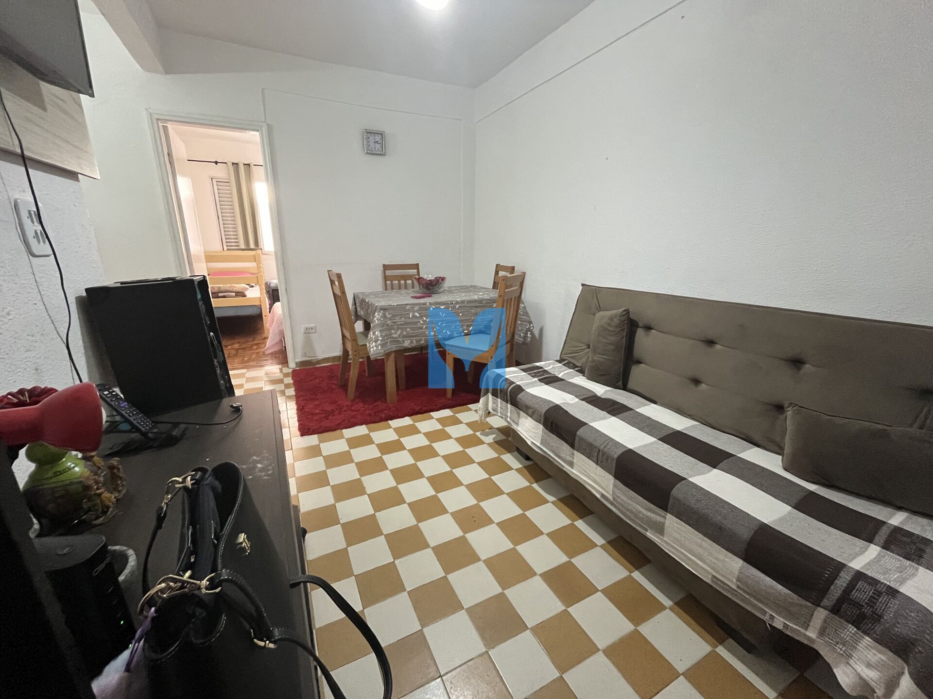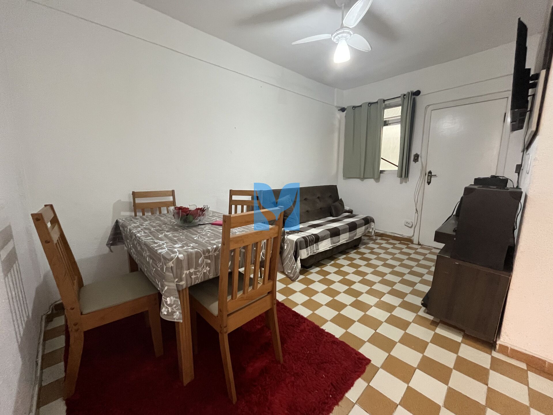 Apartamento à venda no Boqueirão em Praia Grande, SP, 1 dormitório, sala, cozinha, área de serviço, banheiro social e uma vaga de garagem coberta.