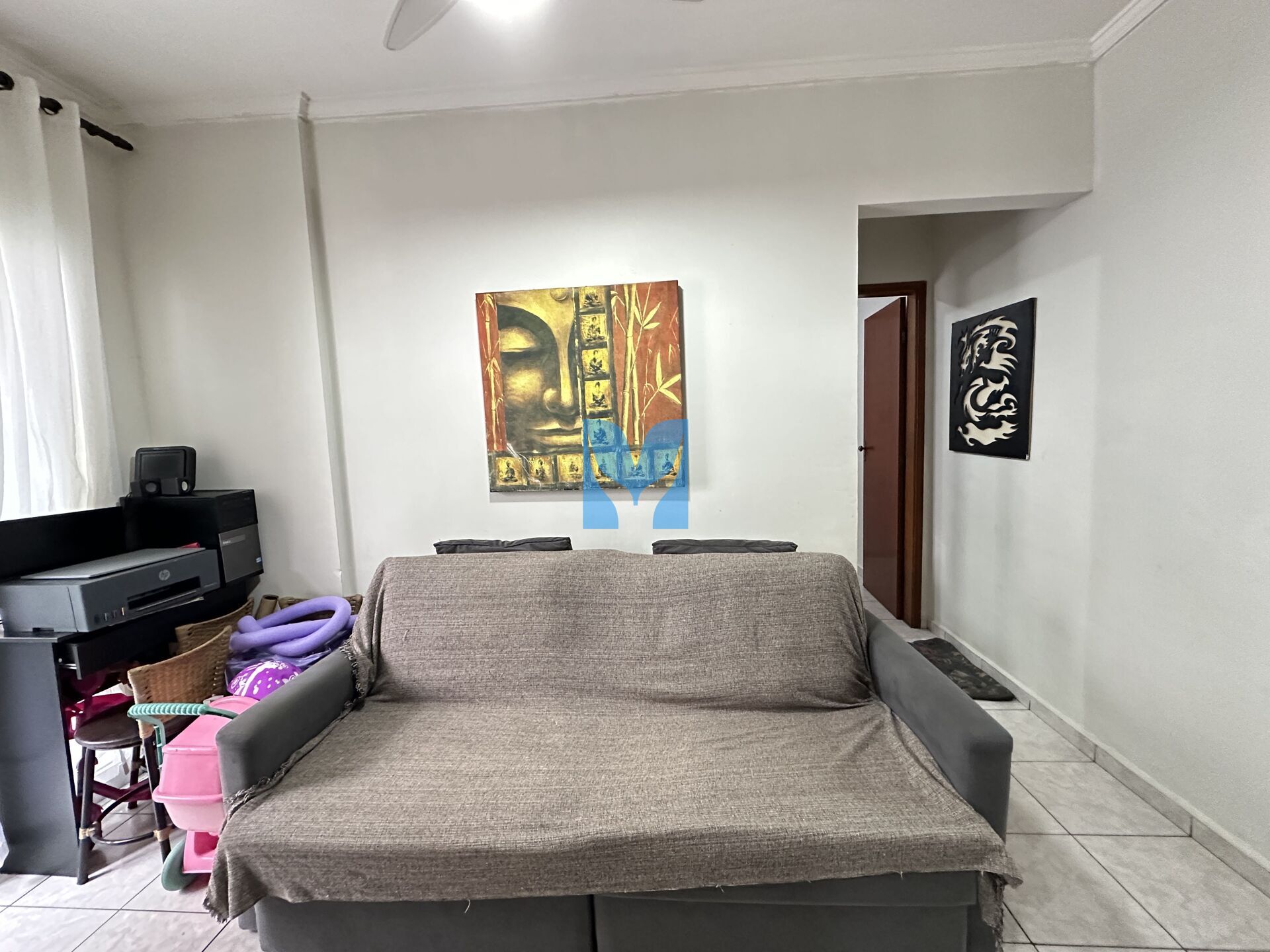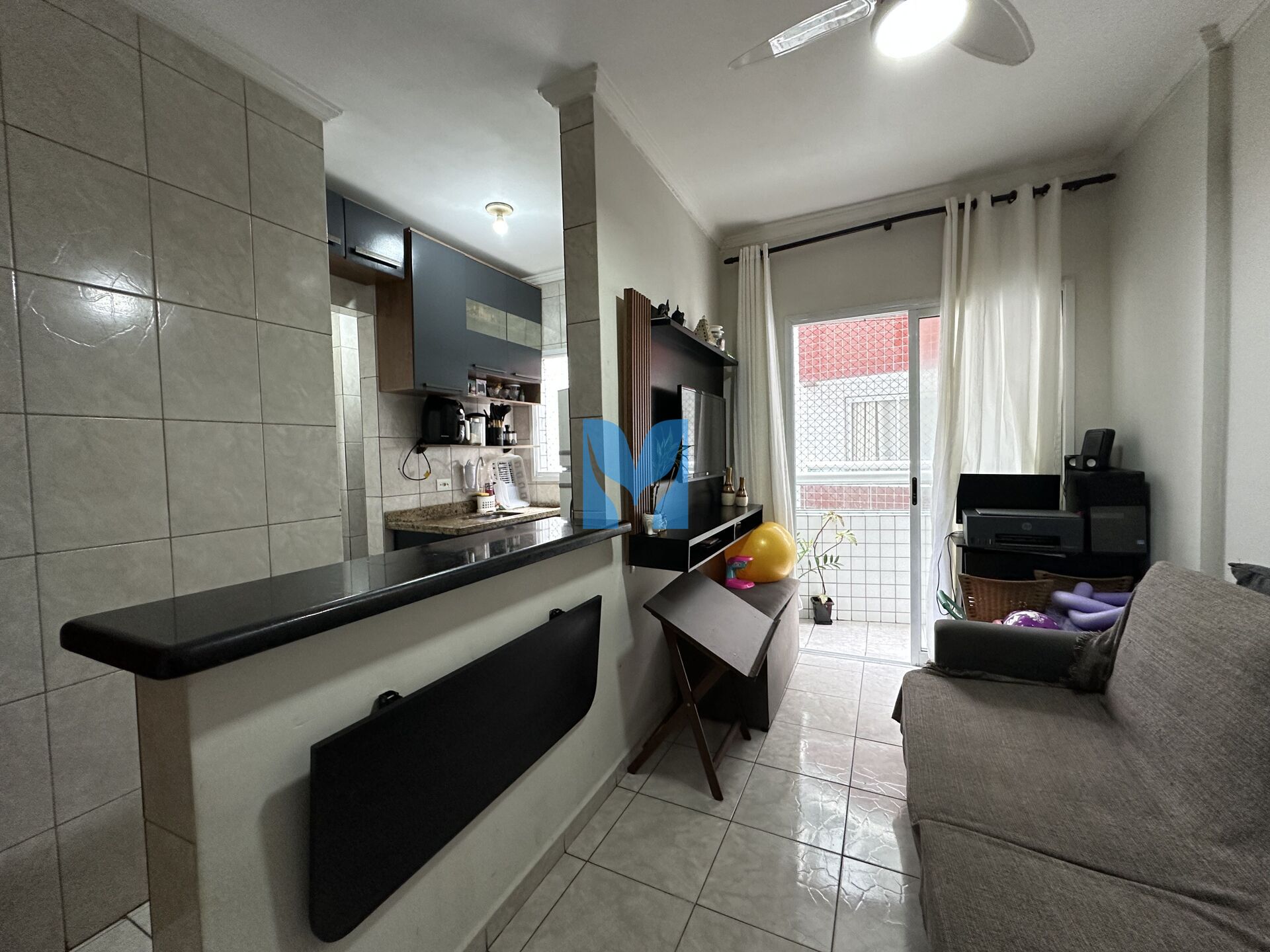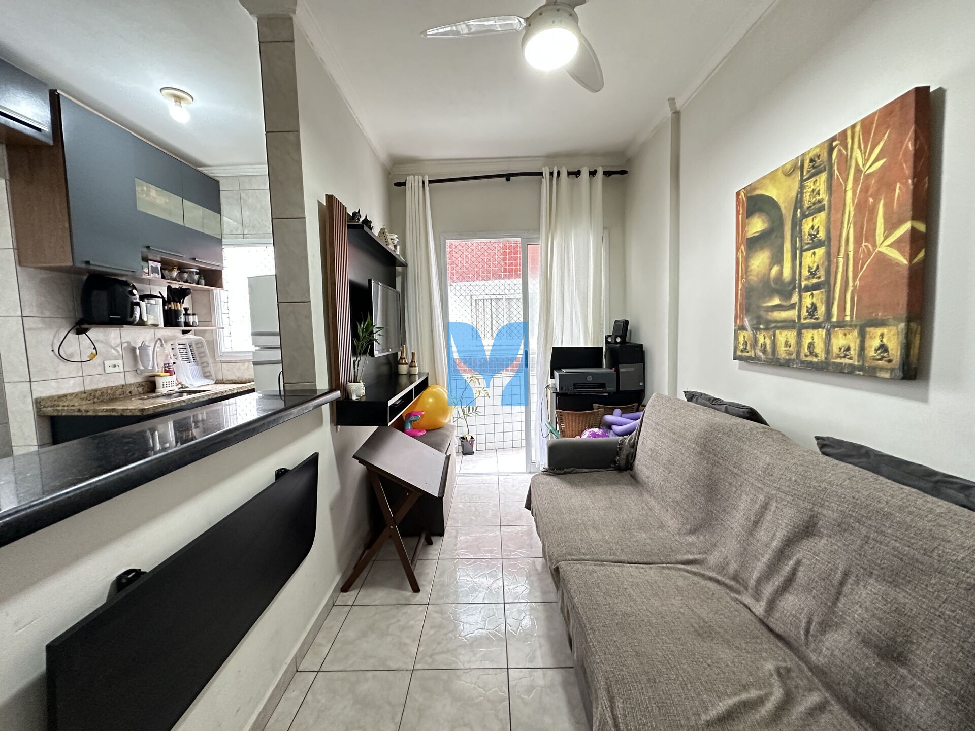 Apartamento com planejados à venda no bairro Ocian em Praia Grande, SP. Com 1 dormitório, sala com sacada, cozinha, área de serviço, banheiro social e uma vaga de garagem.