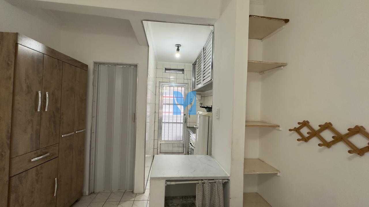 Apartamento Kitnet à venda no bairro Guilhermina em Praia Grande, SP. 1 dormitório integrado a sala com sacada, cozinha, área de serviço na sacada, banheiro social e uma vaga de garagem.