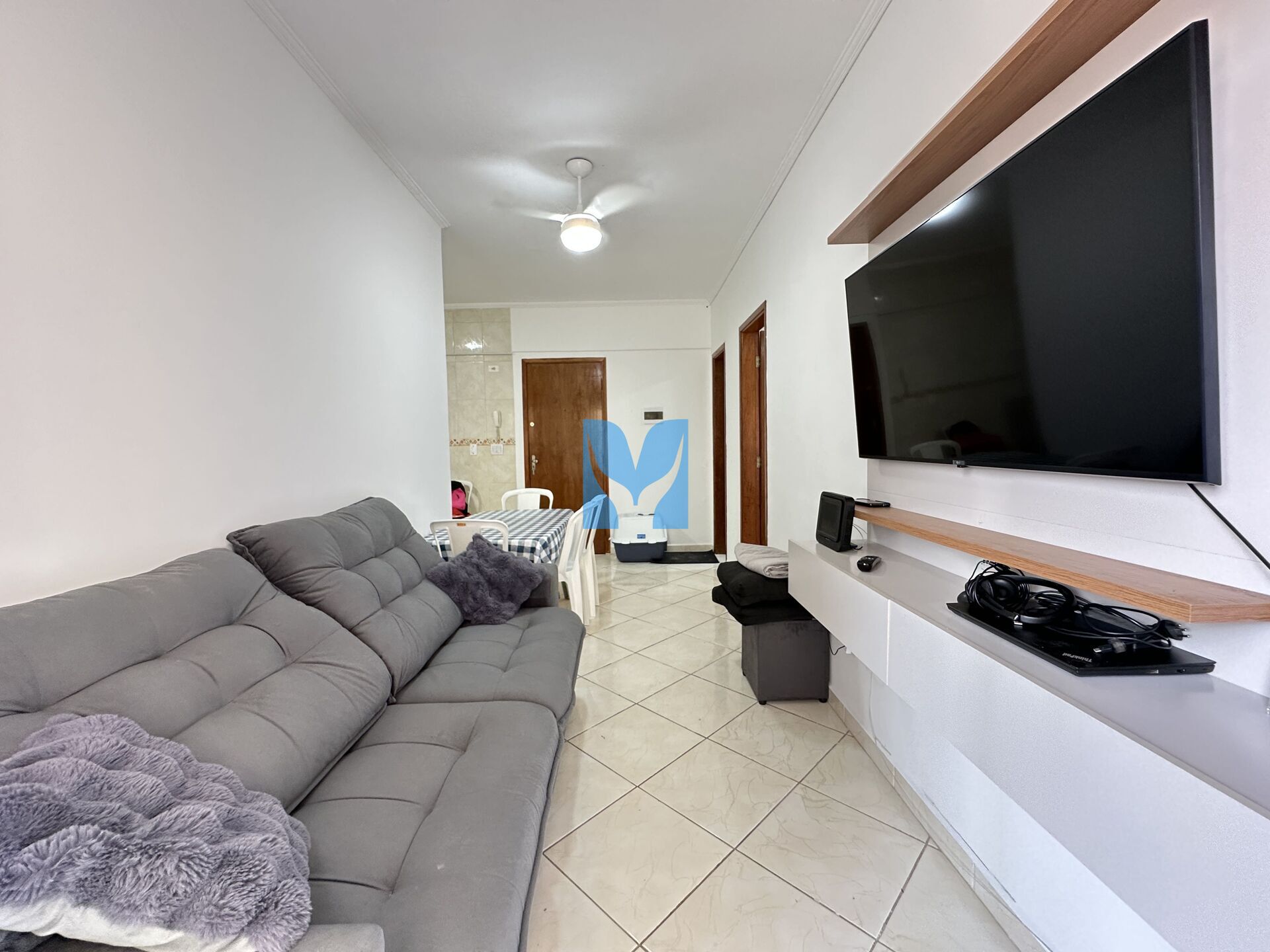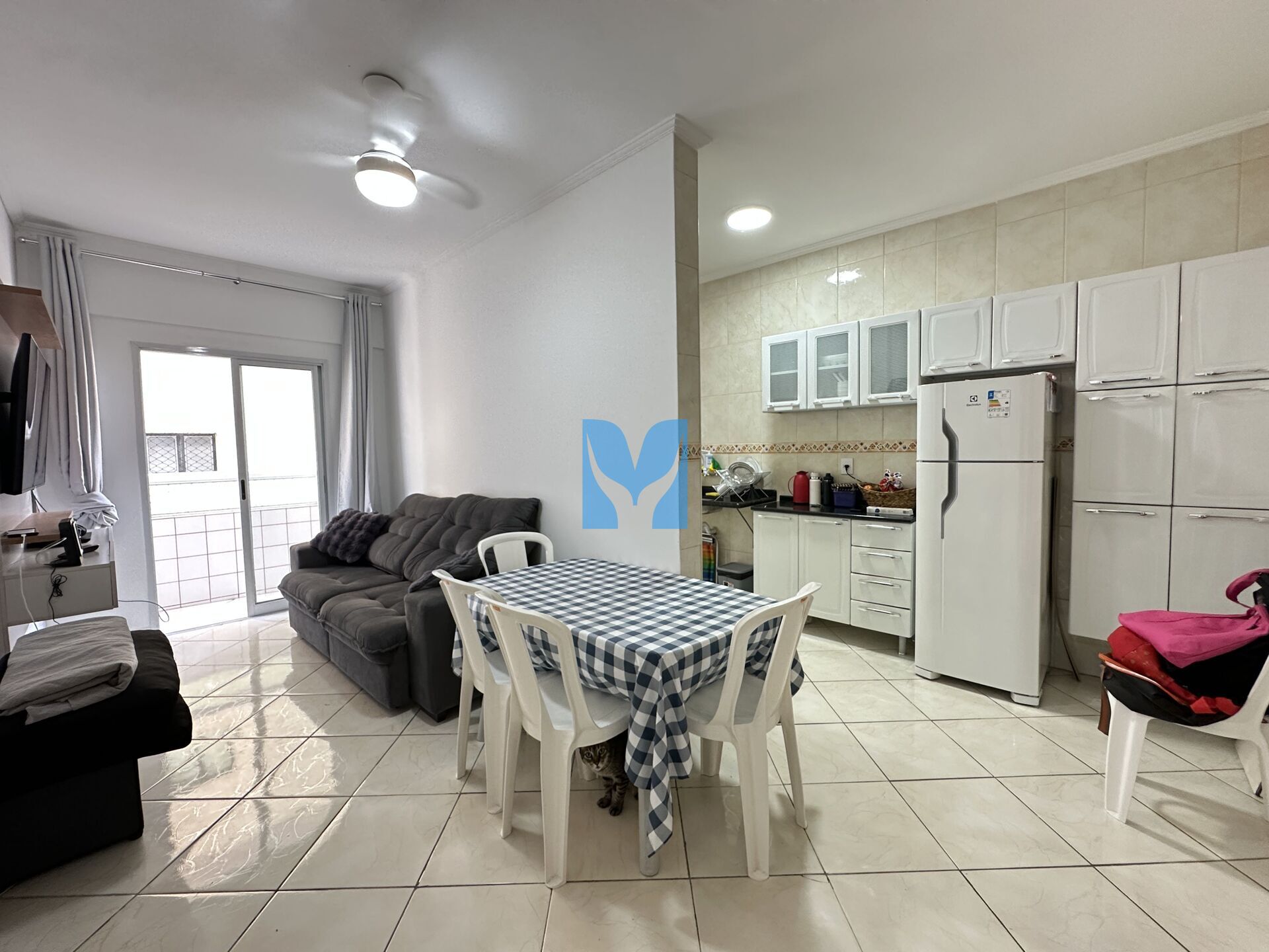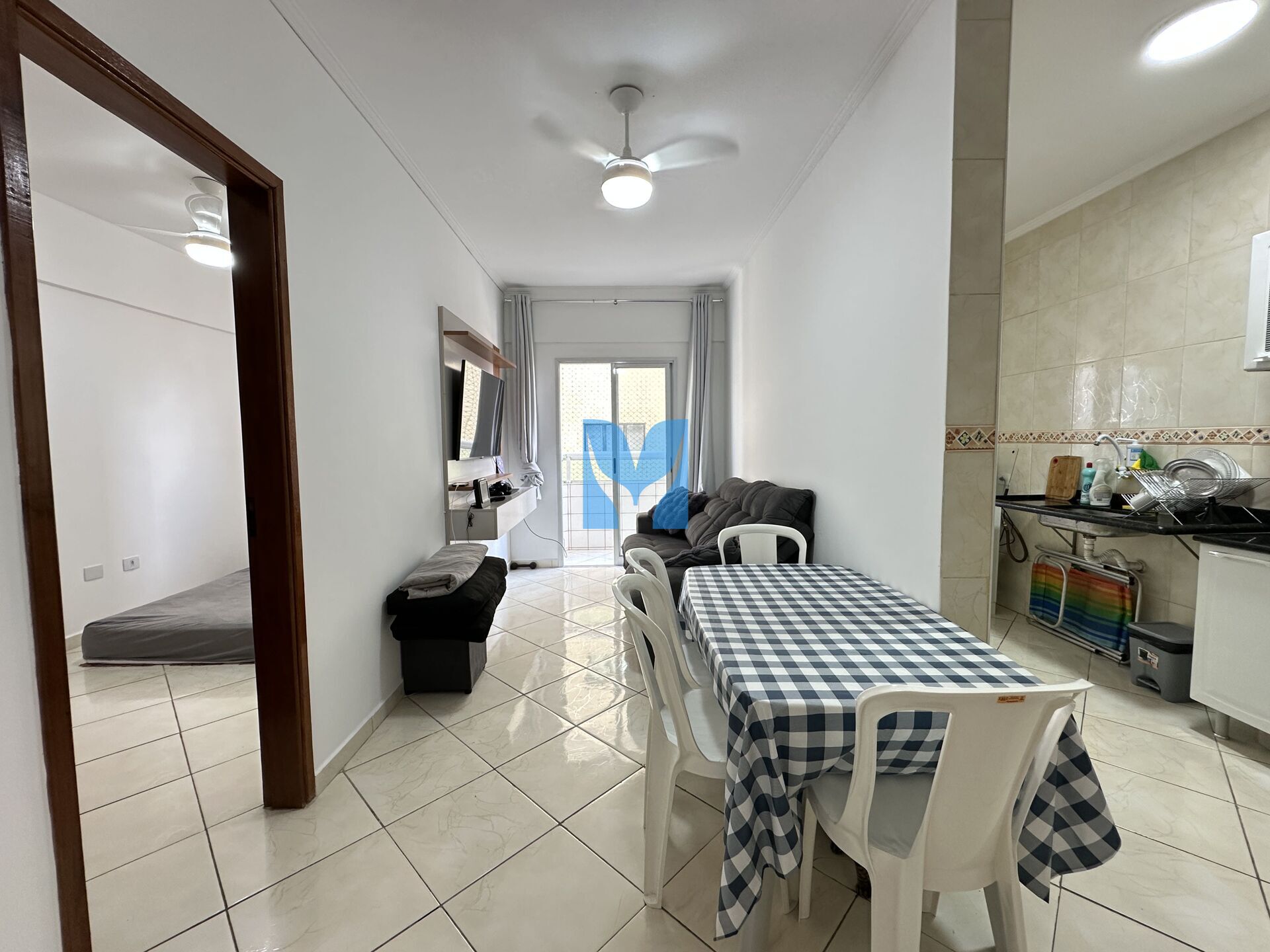 Apartamento à venda no bairro Maracanã em Praia Grande, SP. Com 1 dormitório, cozinha, sala com sacada, área de serviço, banheiro social e uma vaga de garagem.