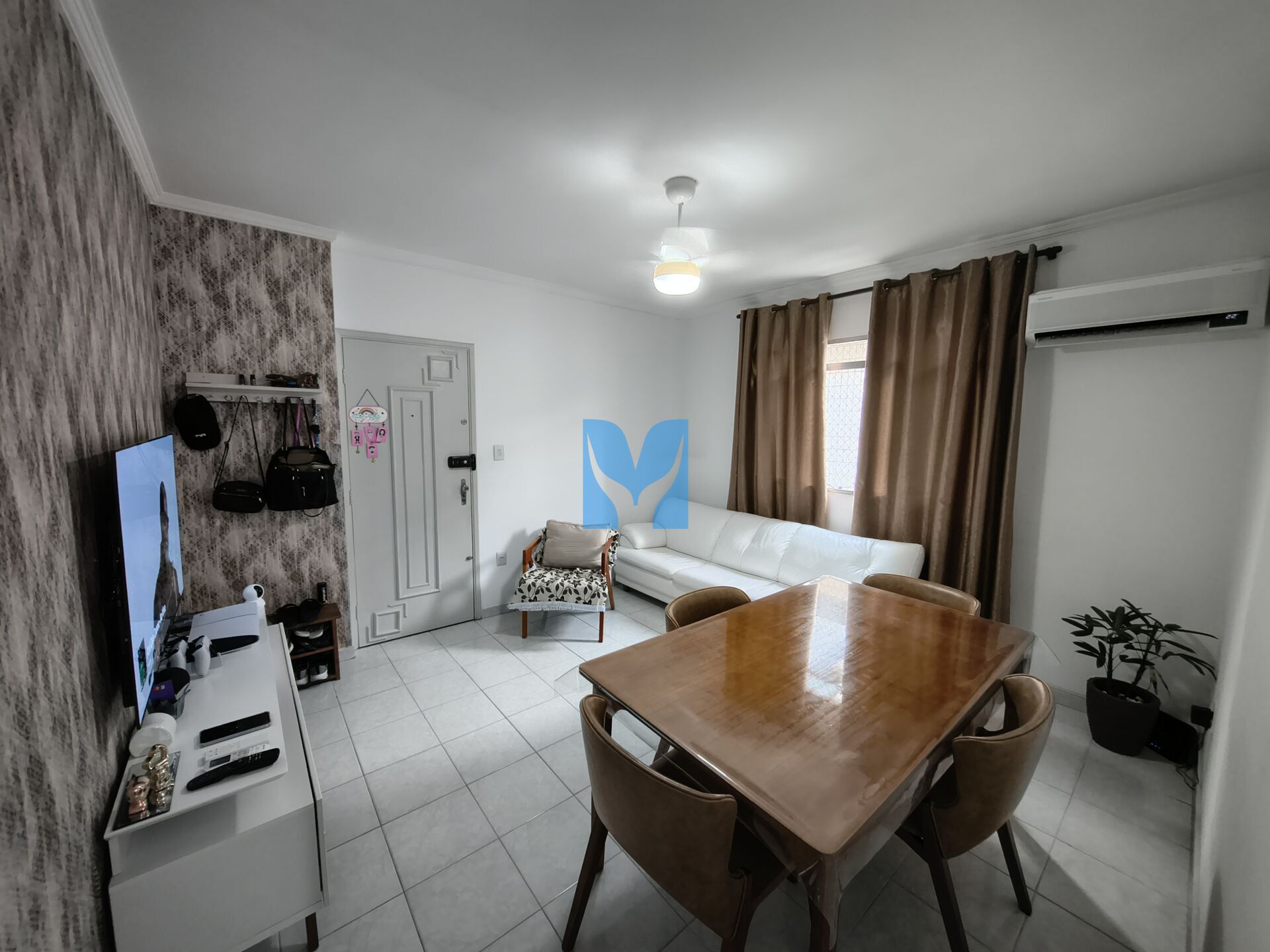 Apartamento semi mobiliado à venda no Boqueirão Praia Grande, SP. 2 dormitórios com sacada, sendo um suíte, sala, cozinha, área de serviço, banheiro social e uma vaga de garagem coberta.