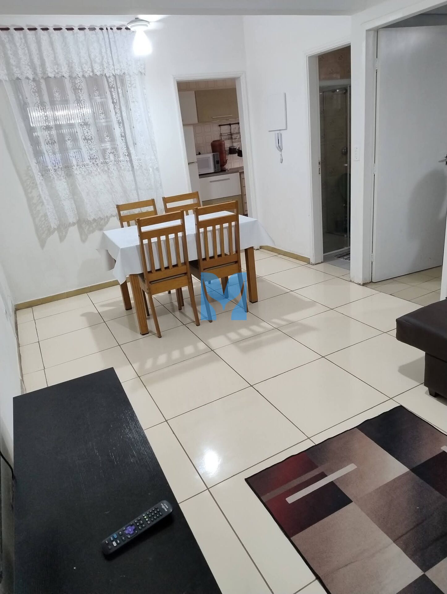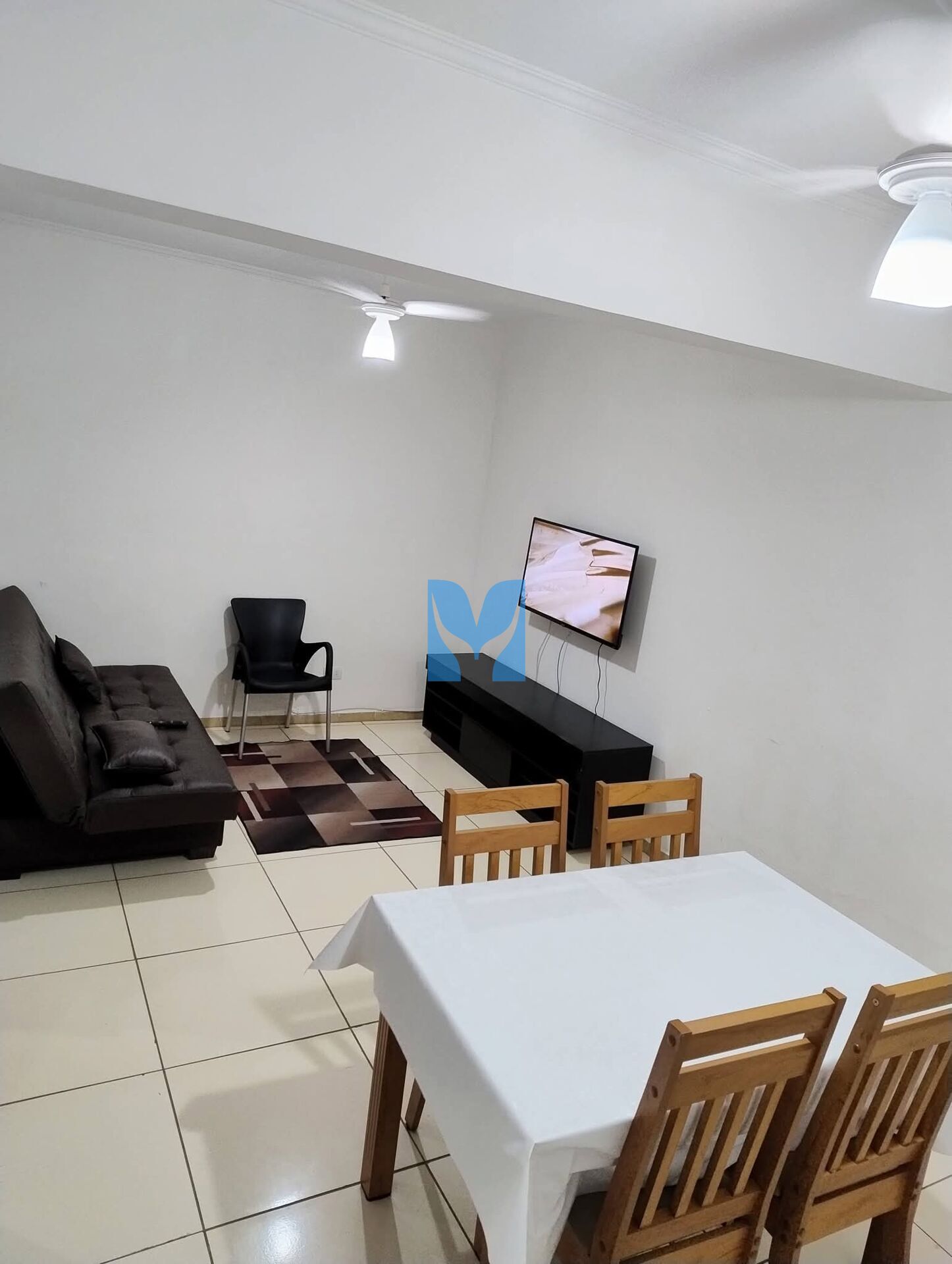 Apartamento Mobiliado à venda na Aviação Praia Grande, SP. 1 dormitório, sala, cozinha, área de serviço, banheiro social e uma vaga de garagem.