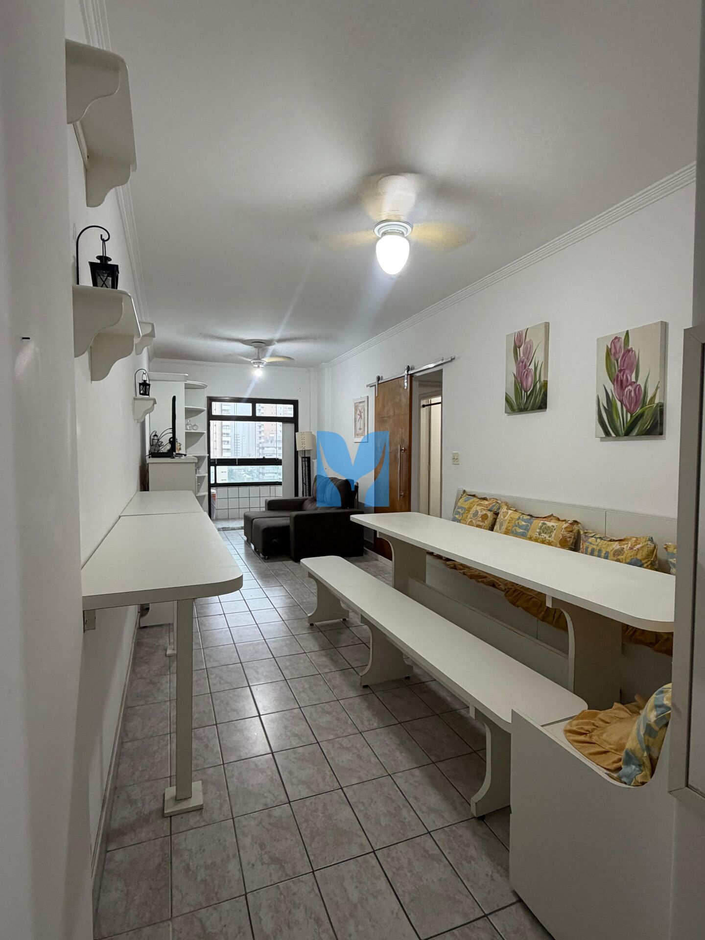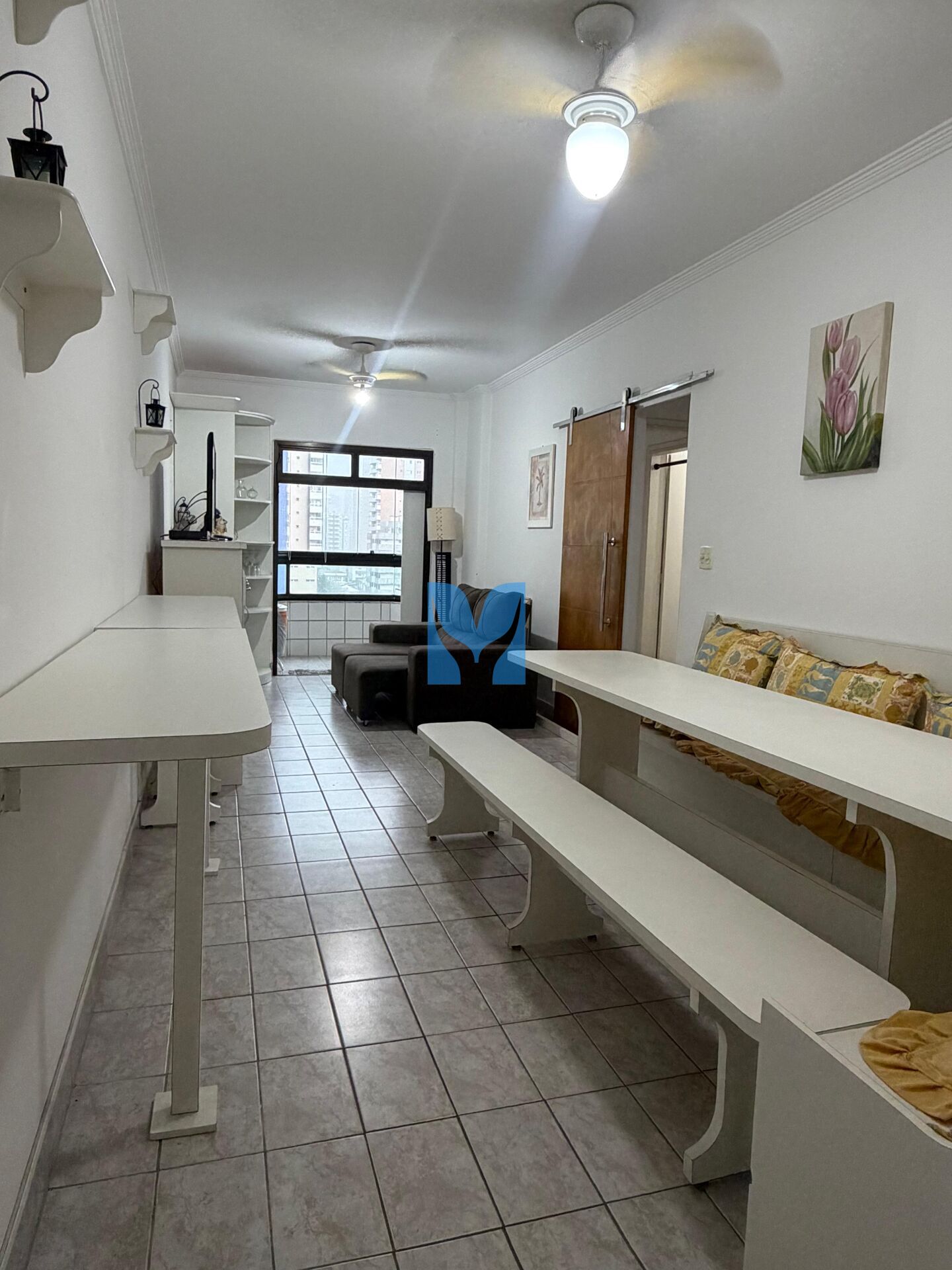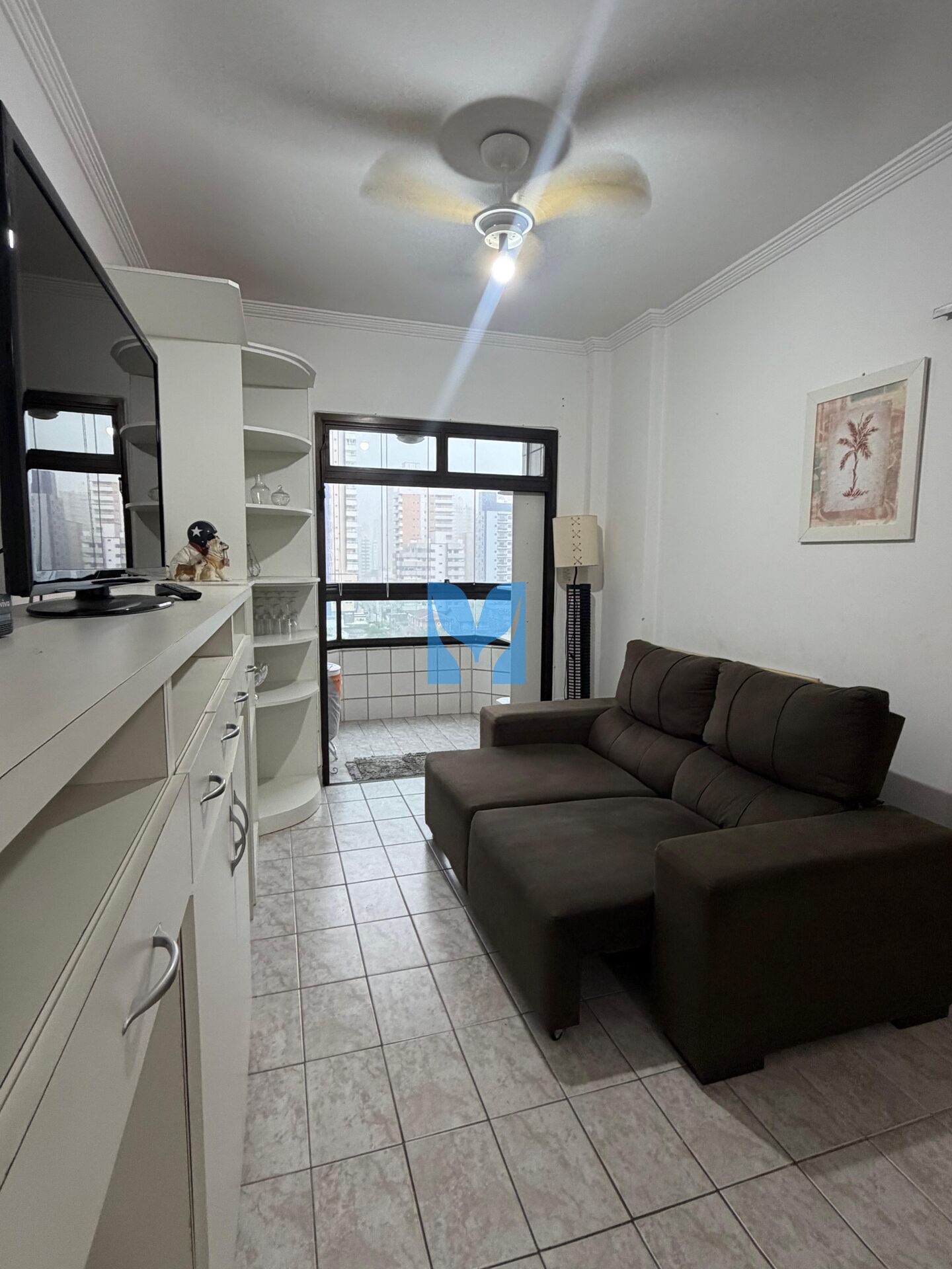 Apartamento com sacada vista Mar, mobiliado à venda no bairro Aviação em Praia Grande, SP. 2 dormitórios, 1 suíte, sala com sacada envidraçada, cozinha, área de serviço, banheiro social e uma vaga de garagem.
