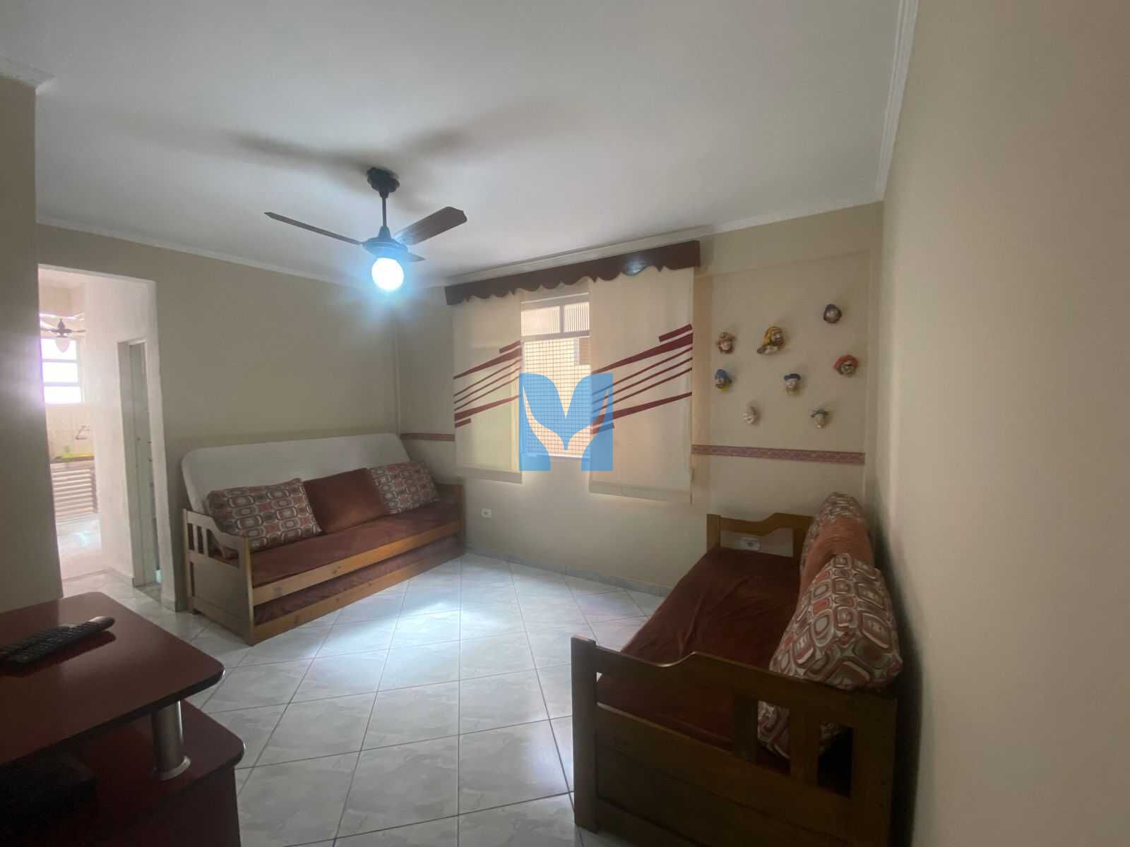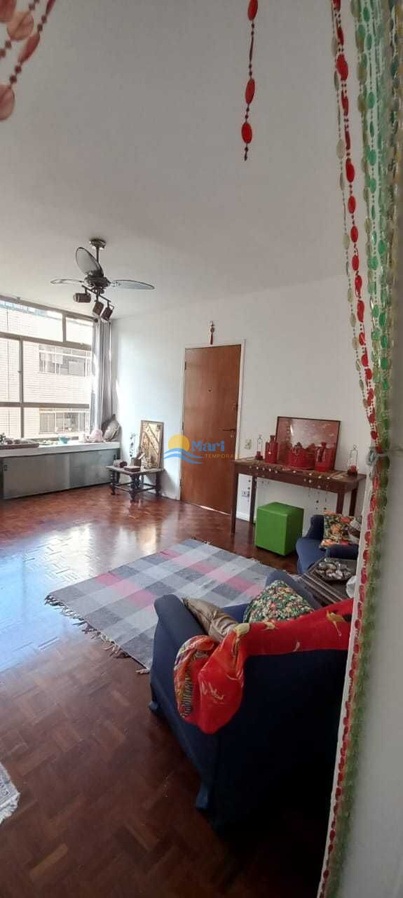 Apartamento à venda no bairro Aparecida em Santos, SP. 1 dormitório, sala, cozinha, 2 banheiros, área de serviço e uma vaga de garagem demarcada.
