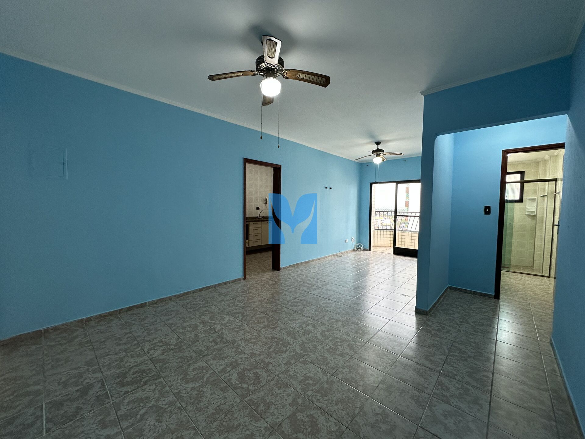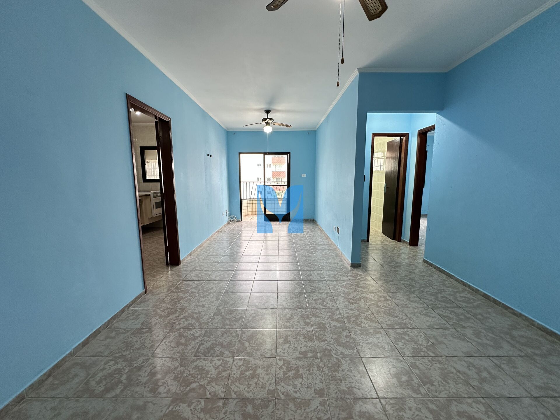 Apartamento para locação no bairro Tupi em Praia Grande, SP. 1 dormitório, sala 2 ambientes com sacada, cozinha com planejados, área de serviço, um banheiro social e uma vaga de garagem.