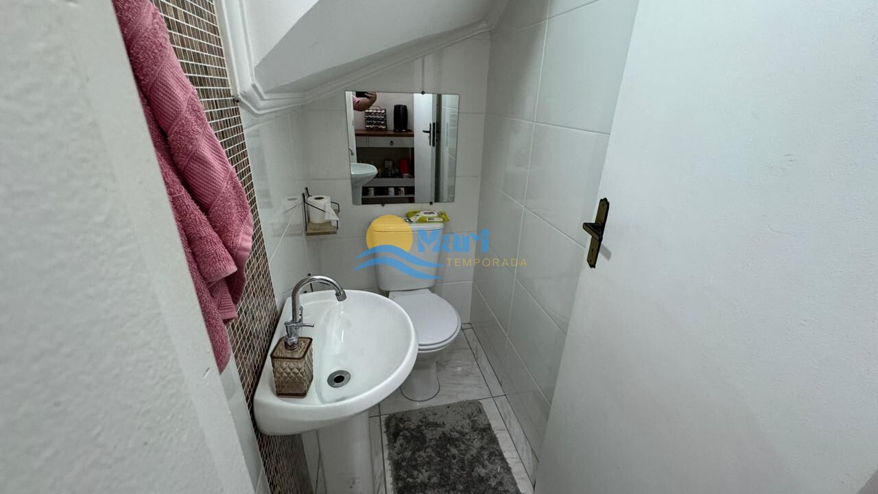 Casa em condomínio à venda no bairro Boqueirão em Praia Grande, SP. 2 dormitórios, sala, cozinha, área de serviço, banheiro social, lavabo e uma vaga de garagem.
